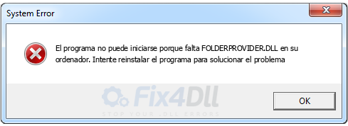 Para arreglar los errores relacionados con el archivo .DLL necesita descargar FOLDERPROVIDER.DLL y copiarlo en la carpeta de instalación de la aplicación o juego, o copiarlo en la carpeta del sistema de Windows y debería arreglar el error. Si no sabes cómo instalar este archivo, por favor lee nuestro tutorial sobre Cómo instalar archivos DLL