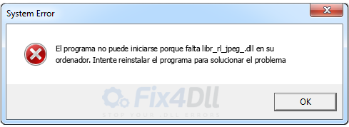 Para arreglar los errores relacionados con el archivo .DLL necesita descargar libr_rl_jpeg_.dll y copiarlo en la carpeta de instalación de la aplicación o juego, o copiarlo en la carpeta del sistema de Windows y debería arreglar el error. Si no sabes cómo instalar este archivo, por favor lee nuestro tutorial sobre Cómo instalar archivos DLL